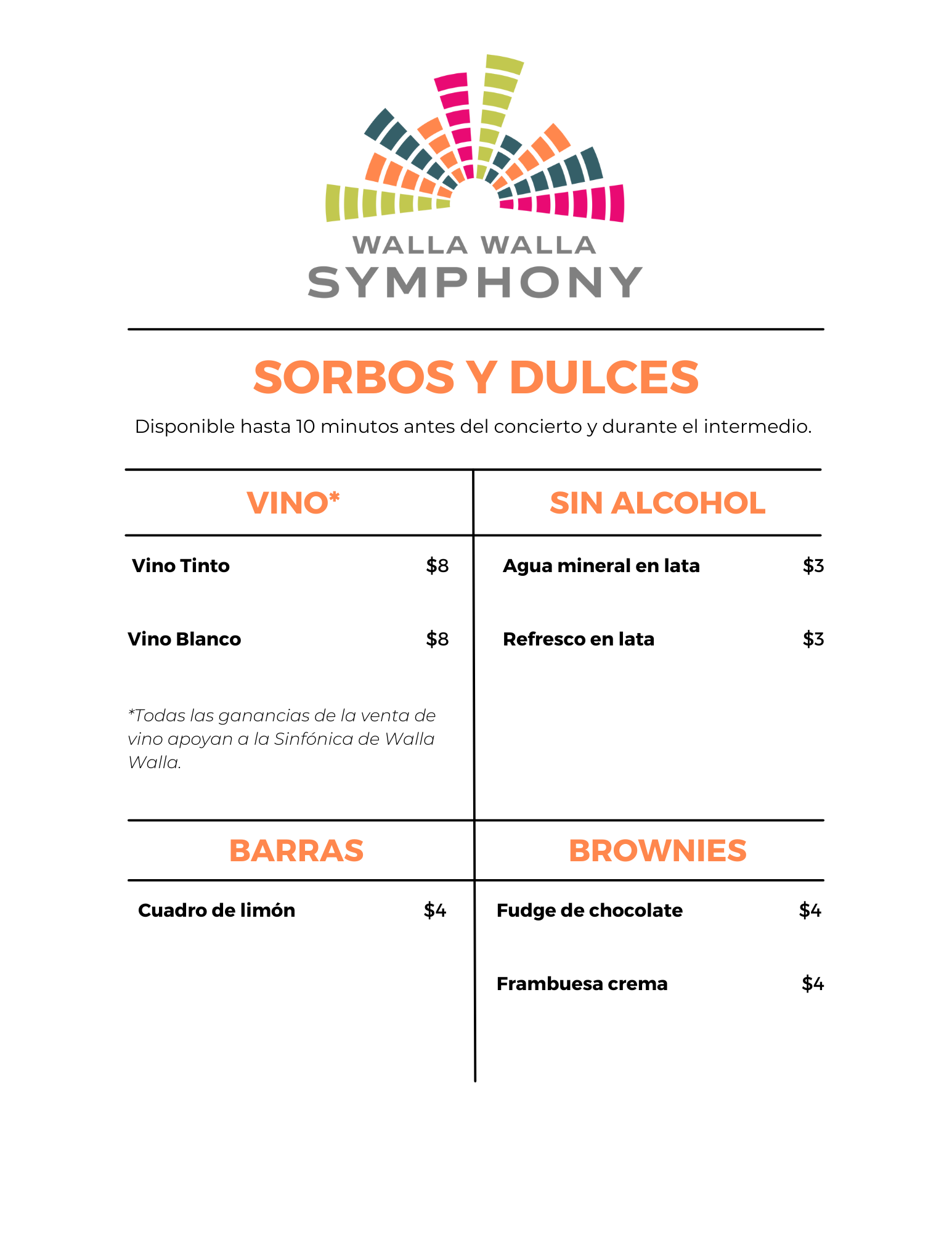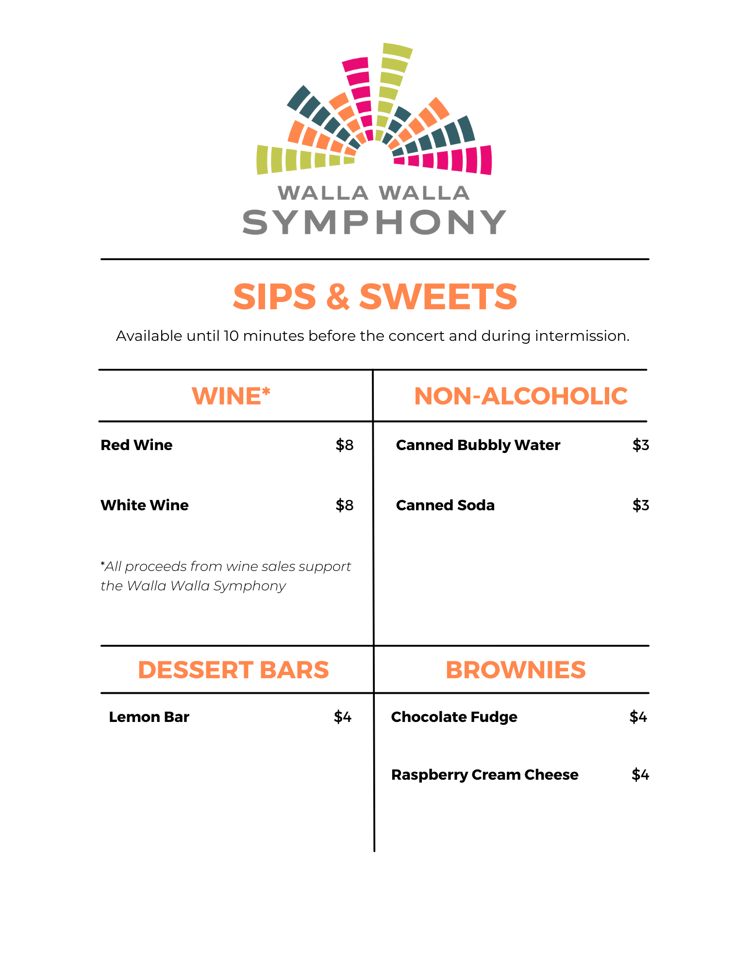 Join us for Sips & Sweets in the lobby until 10 minutes before the concert and during intermission. Purchase a glass of wine from our featured wine sponsor, a non-alcoholic beverage, or a sweet treat (all proceeds support the Walla Walla Symphony).